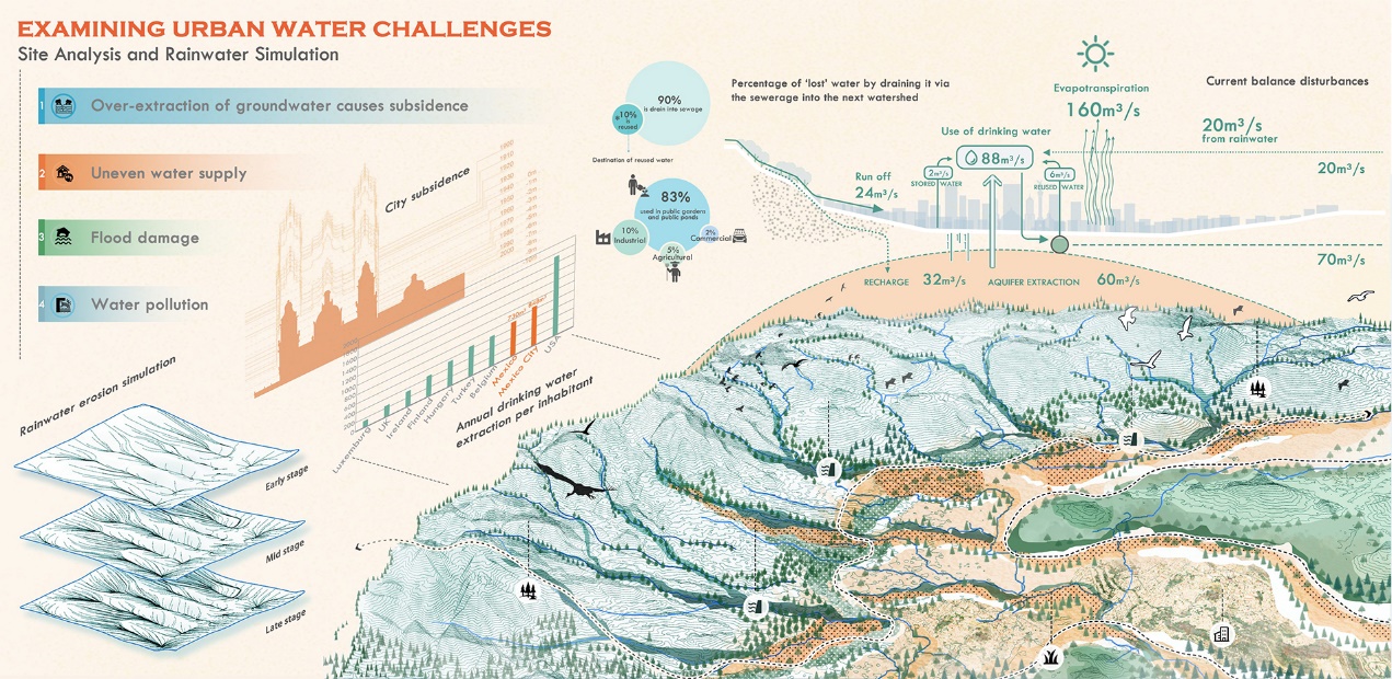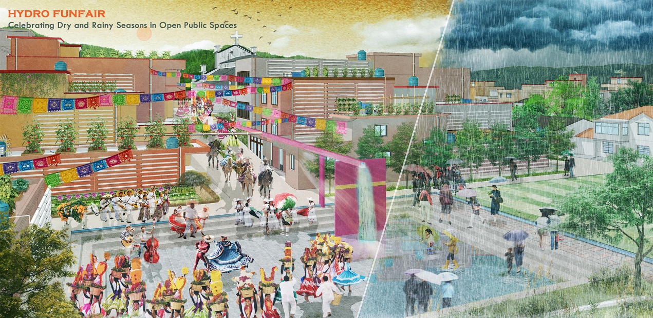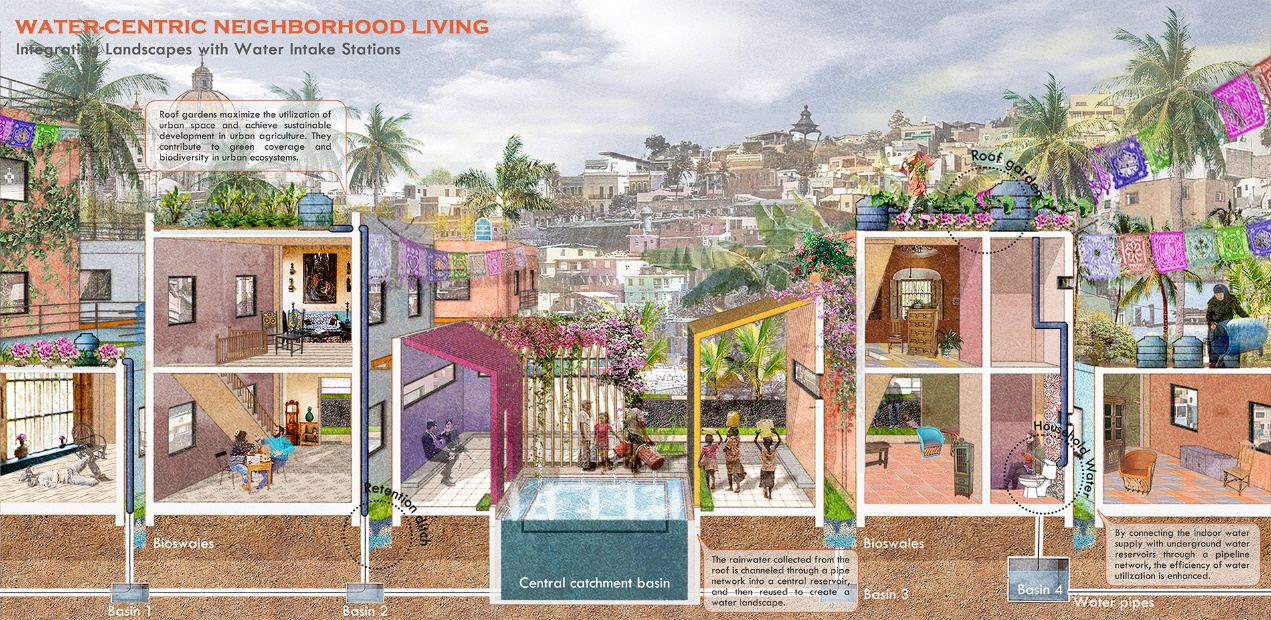 本项目聚焦墨西哥城季节性水问题,深挖历史成因与民生现状,为典型区域定制改造方案。通过景观基础设施的创新,灵活调配城市水资源,实现自然、城市、生活与宗教文化的和谐共生。项目旨在促进墨西哥城水资源可持续利用与环境可持续发展,通过典型区域示范,构建景观基础设施工具包,融合自然水循环与城市生活,提升居民生活质量、经济生产和生态环境,同时繁荣宗教文化。