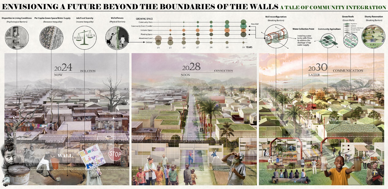 本方案是一个分阶段的动态演进的过程,两侧墙体内的条带状绿地如同缝合般将两社区联结。场地平面图显示了方案在不同空间维度和时间维度的动态变化,场地的演变将两个种族之间的空间和心灵隔阂彻底消解(图6)。