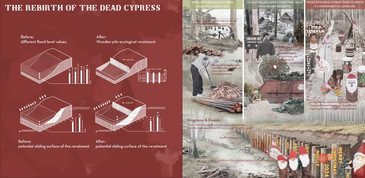 同时我们还综合考虑了社区的安全和可持续发展,项目特别注重社区参与,结合当地的圣诞庆祝文化,将死亡杉树改造为生态驳岸,并通过圣诞树回收活动,鼓励居民参与生态修复。这不仅增强了公众的环境保护意识,也为社区活动提供了新的平台。