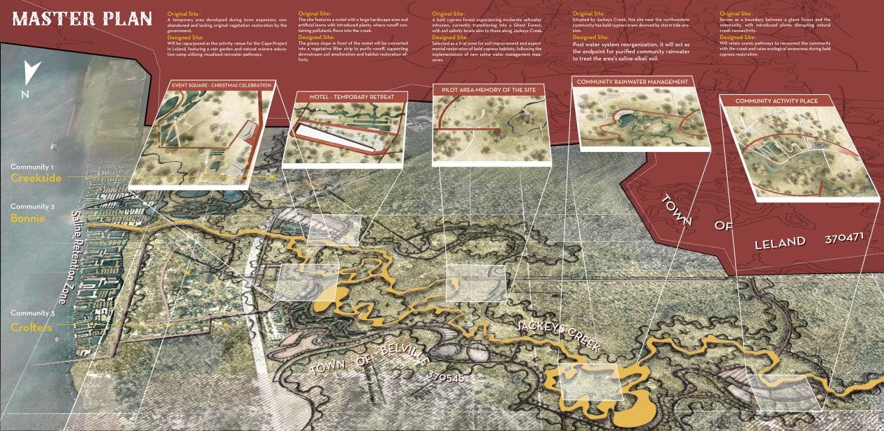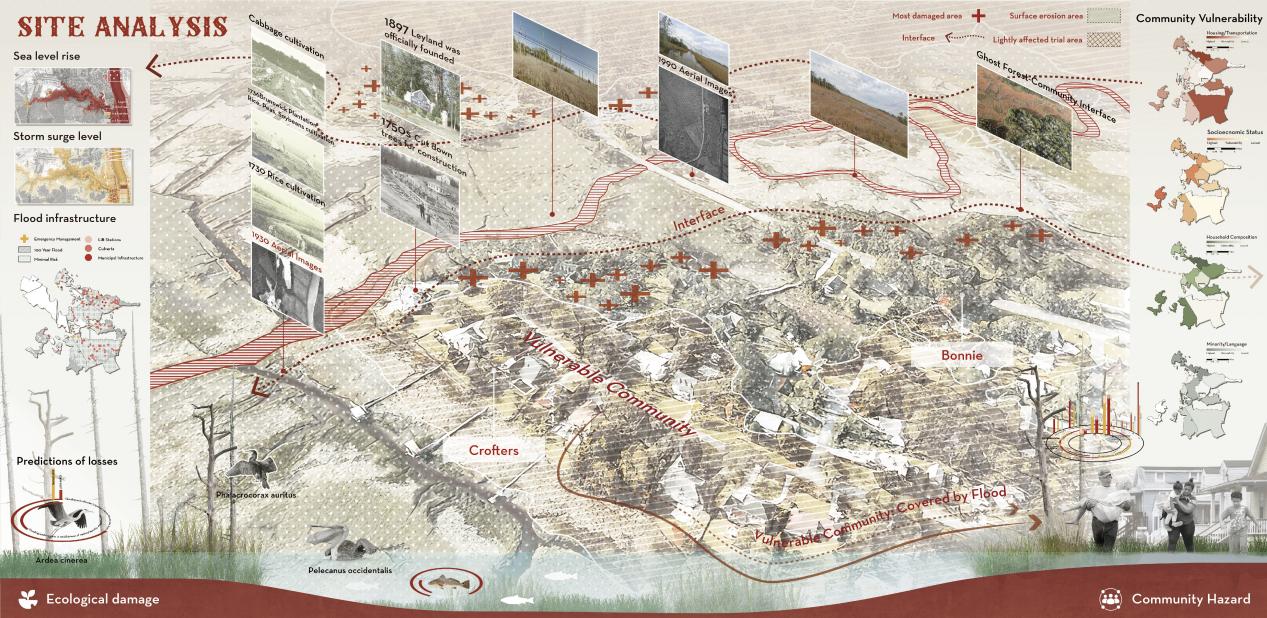同时,我们基于场地关键词找到了相关网络资料。相关学者的研究证实了Jackeys Creek沿岸杉树大量死亡所导致的物种减少和社区暴露问题。这些背景资料为我们应对幽灵森林问题和周边社区日益迫切的风暴潮威胁提供了策略依托,有助于我们制定更加有效的生态修复和社区保护策略,重建区域的生态平衡和人居环境安全。
