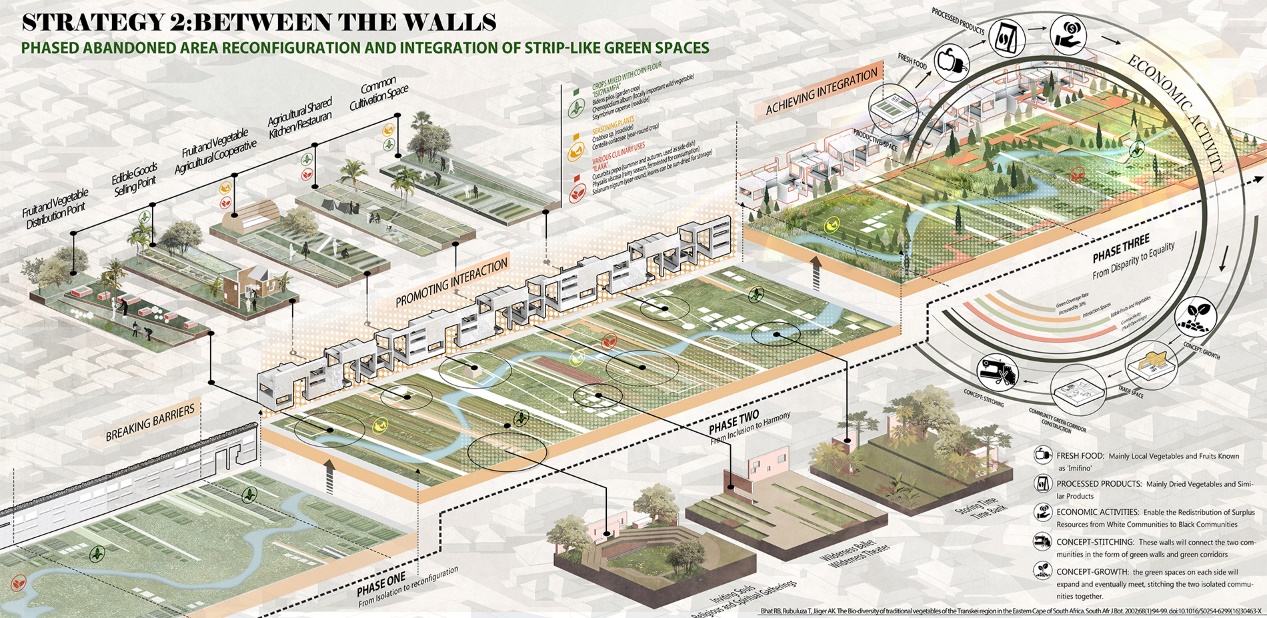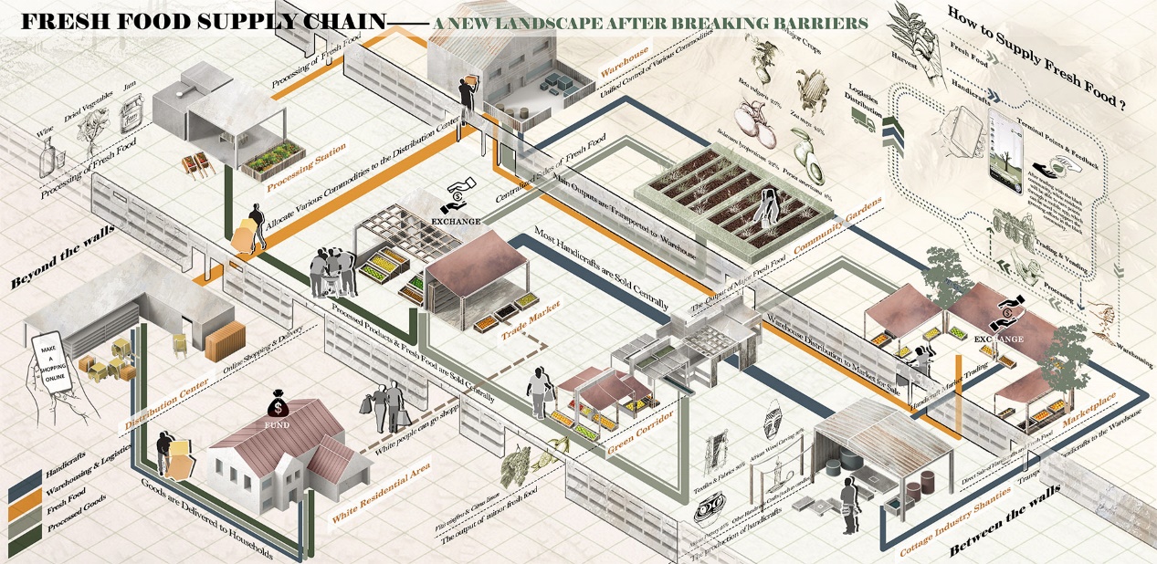 总体策略包含生长与缝合两个概念。其中生长的概念将应用于墙壁及其周围的社区。静态的墙壁将随时间转变,被不断改造,形成的空间又不断分化,最终向两侧社区扩展。这些墙壁不再仅限于混凝土结构,它们将以绿色墙和绿色走廊的形式连接两个社区。墙体将承担雨水收集与净化、农产品产出等职能,同时分化出的空间又为新鲜食物供应链的形成提供了物理条件(图7)。