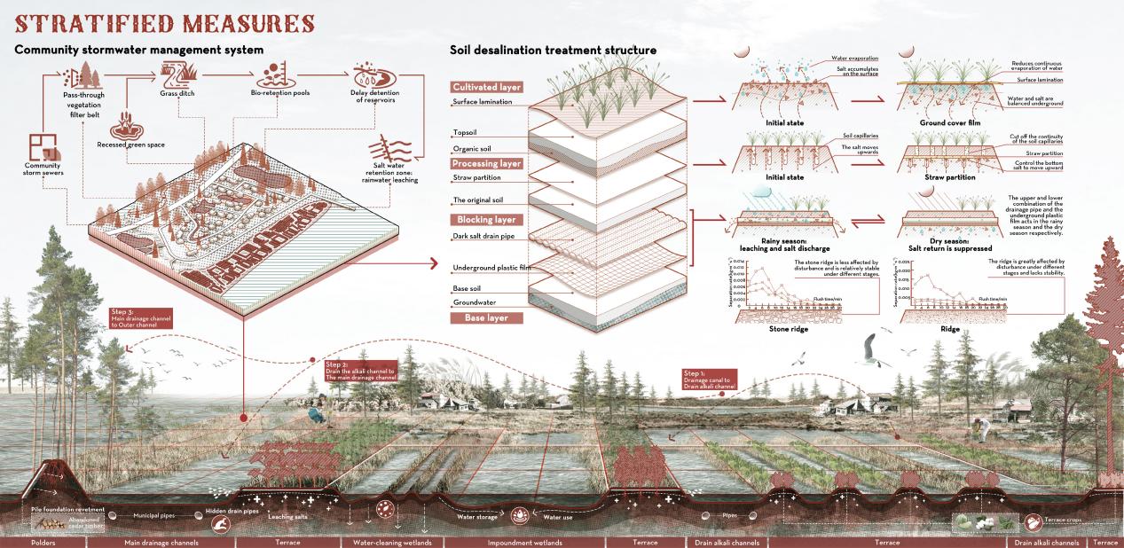 在盐水滞蓄带的构建过程中,我们将土壤盐碱化改善的工程措施与各基础单元结合,在不同土层设置相应的脱盐处理工程,并查阅研究资料进行数据验证。通过这种方法,可以有效减弱表层土壤的盐分沉积。同时,我们计划利用社区收集的雨水进行淋溶处理,可持续性设计的基础上进一步降低土壤盐分,改善土壤质量。这些措施将为落羽杉及其他植物的生长提供更好的环境基础,促进生态系统的恢复与稳定(图7)。