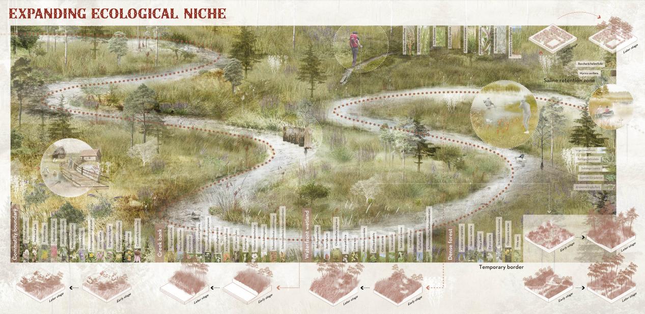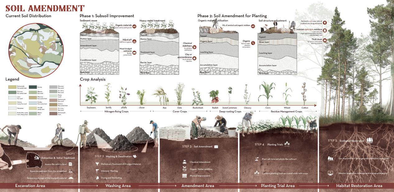 项目从恢复落羽杉生境的角度出发,在复生前期项目将通过两条策略路径抑制盐水侵蚀,同时对沿岸盐碱土进行改良。复生中期将构建草本植物为主的群落,并利用植物措施扩充新生态系统的生态位,最终将在Jackeys Creek沿岸形成较稳定的落羽杉生态系统,新的生态系统也是一套完整的风暴潮防御系统。通过这一战略,不仅保护了落羽杉这一关键生物主体,还提升了社区的生态安全与防御能力,为当地居民提供了更安全的生活环境(图4)。
