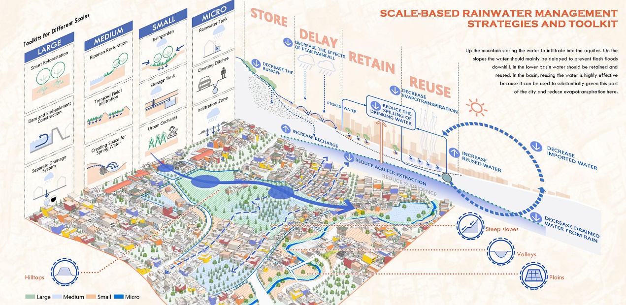 针对区域特点与问题,小组成员提出了四大解决策略:存储、延缓、保留和回用,利用雨水平衡策略与工具包(图4),将基于空间的水管理落实在场地中,以平衡雨水分配。
