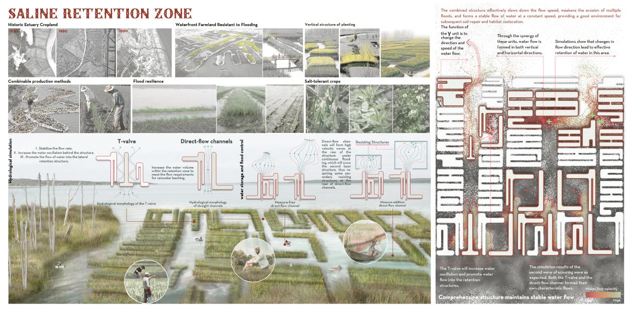 垛田是一种经人工改造的地表形态,能够有效地抵御和滞蓄洪水。我们团队对传统垛田进行研究,提取了基本单元并使用流体软件进行水文模拟,依据不同单元对水流扰动的特性进行组合设计(图6)。通过组员观察和软件反复测试,合理布局引水组团与蓄水组团,将盐水有效控制在Jackeys Creek河口区域。这一策略不仅能减缓盐水对中上游植被的进一步侵蚀,还为生境修复提供了适宜的环境,同时也帮助放空沿岸洪水的风险。