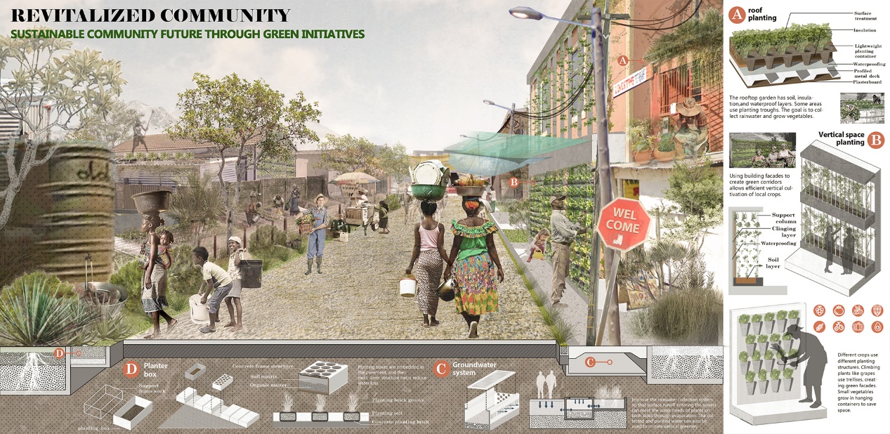 在双方社区内,我们同样使用了“生长”的策略。为了解决黑人社区中的环境不公正问题,我们将建立随时间生长的绿色走廊,为黑人社区提供更多的绿色空间。这些走廊将沿着社区街道连接先前置入的各种改造空间,并与翻新的棚屋和绿色墙体结合。在较长的时间内(3-7年),社区居民的共同努力将延伸这些走廊,使得其连接整个社区。这些绿色走廊将有助于收集和净化雨水,其中种植的当地的水果和蔬菜有利于增加水和食物的供应(图12)。主要措施包含打通墙体、通过绿廊向外建设、通过行道树以及垂直绿化提高绿视率来形成绿墙。同时绿廊串联恢复社区内正式与非正式绿地,增加社区内绿地可达性与覆盖率,沿绿廊置入生活服务设施,提高居民幸福度同时连通经济产业,带动黑白人社区的交易往来(图13)。