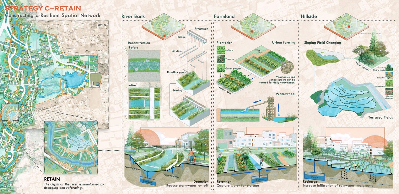 针对区域特点与问题,小组成员提出了四大解决策略:存储、延缓、保留和回用,利用雨水平衡策略与工具包(图4),将基于空间的水管理落实在场地中,以平衡雨水分配。