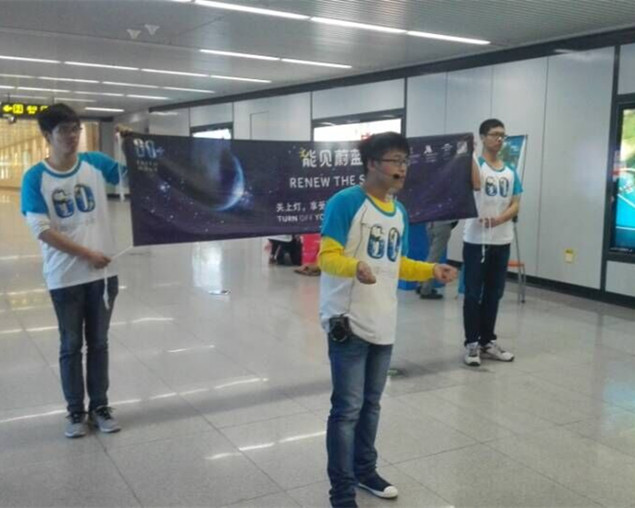 “地球一小时”是世界自然基金会在2007年发出的一项倡议:呼吁个人、社区、企业和政府在每年3月23日熄灯1小时,以此来激发人们对保护地球的责任感。今年,为了呼应当前苏州最急迫、最受关注的环境议题——雾霾,传递环保正能量,苏州大学绿色协会携手苏州万豪酒店联盟开展“能见蔚蓝”地球一小时系列活动,通过地铁快闪,环保骑行,校园不插电演唱会,呼吁市民和学生“关爱地球,解放苍穹”。