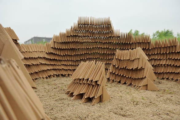 逐梦窑巢:设计从鸟巢和窑洞中提取意象。正是那一排排窑洞避护和栖身了中国共产党的先烈们,它们就像巢一样庇护着和见证着中国共产党的成长。作品循根思源,形成了兼具观测、休憩功能的场所。设计从单体“三角插”入手,通过自身纸板的折叠可以形成无限插接的三角形小单元,每个小单元间有三种插接方式,便于形成曲率不同的平滑曲面,进而形成稳固而多样的空间,也寓意中国共产党扎根于民的夯实群众基础。