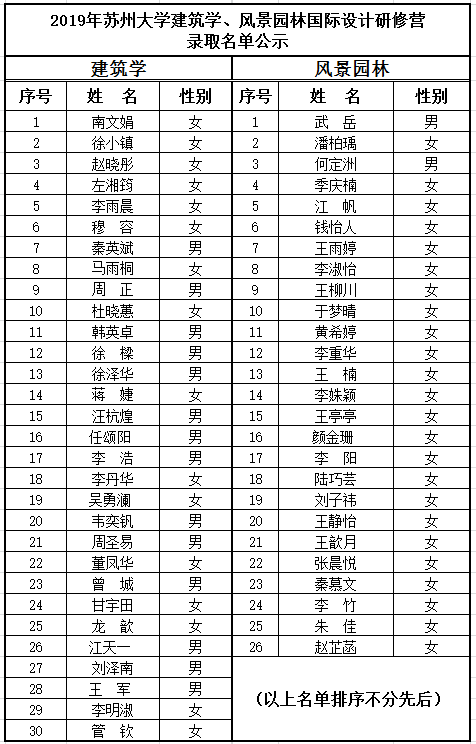2019苏州大学建筑学、风景园林国际设计研修营招生拟录取名单公示